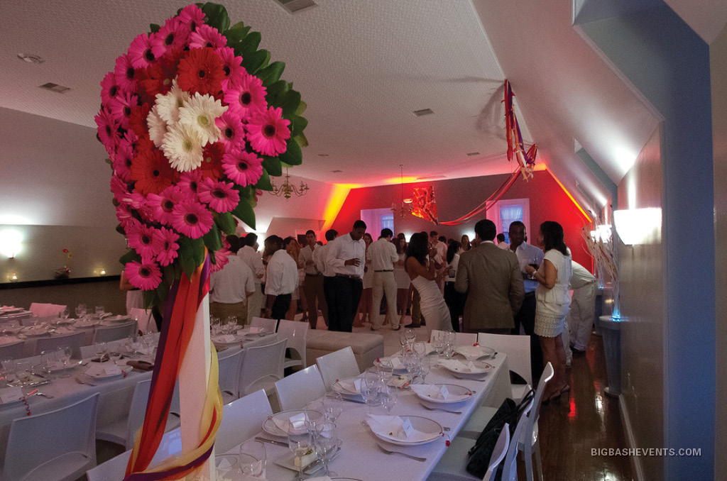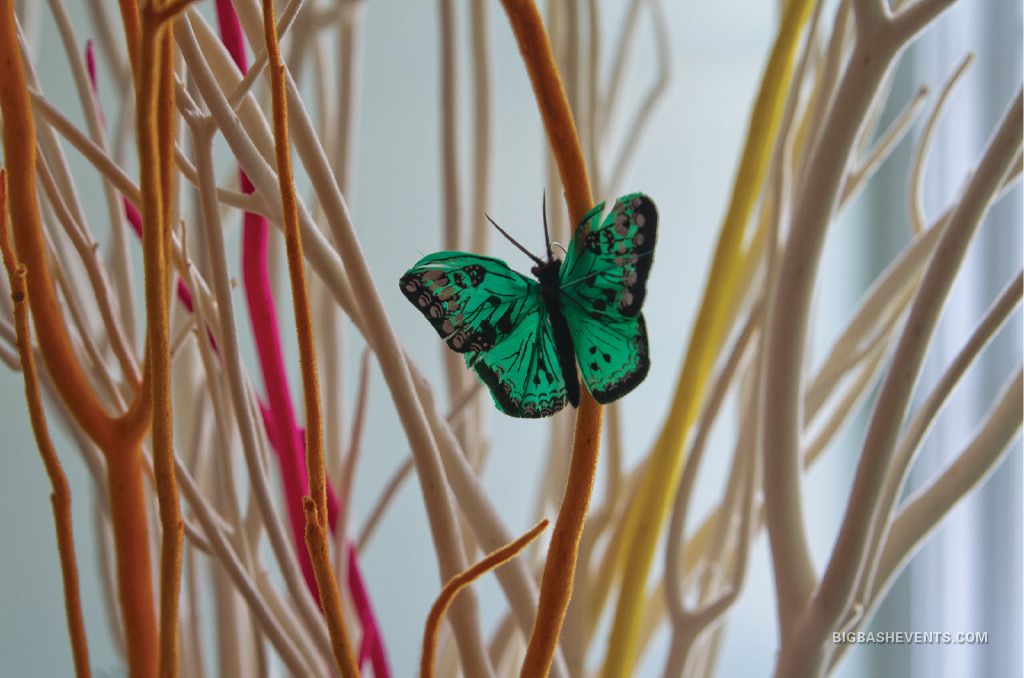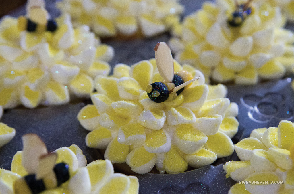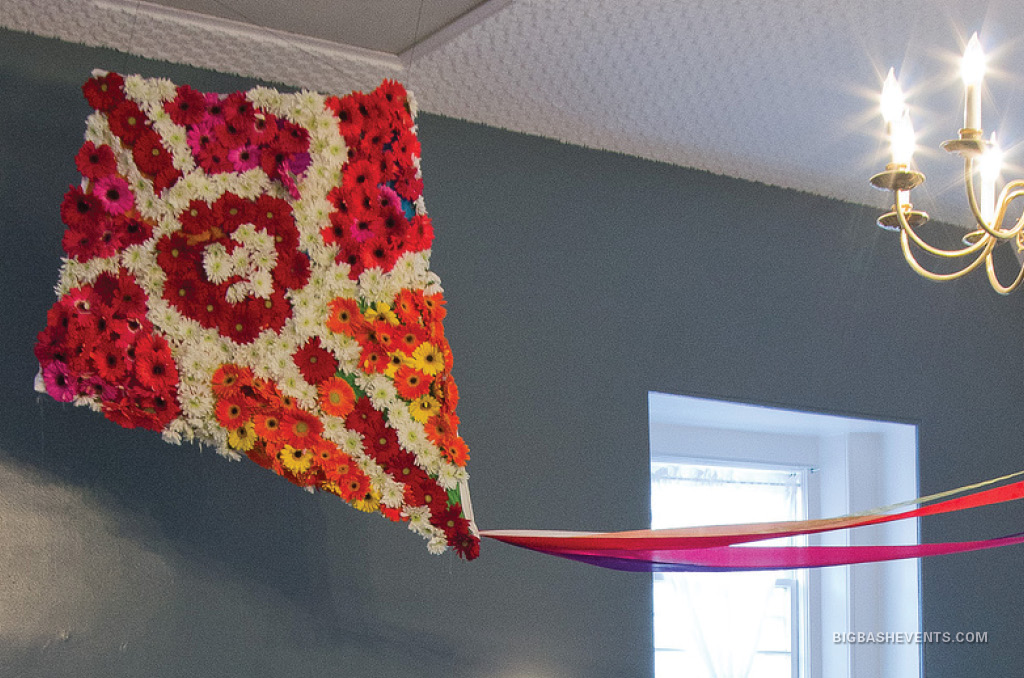 Floral kites soared through the room. Napkins folded to resemble kites with ribbon tails accented with sugar bees.