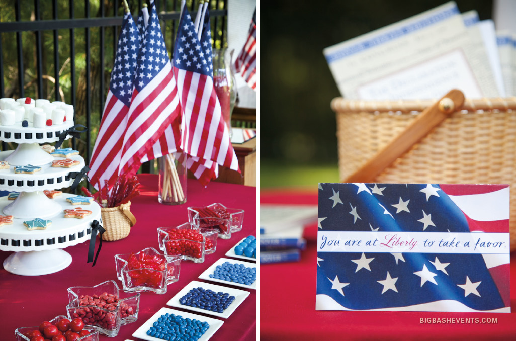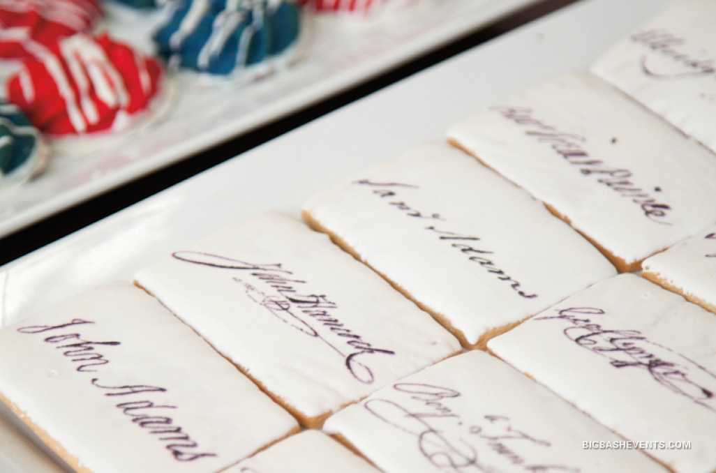 Custom-iced cookies signed by John Adams, John Hancock and the rest of the delegates to the Declaration of Independence. Stars & stripes every which way.