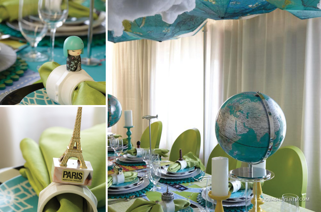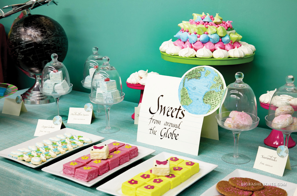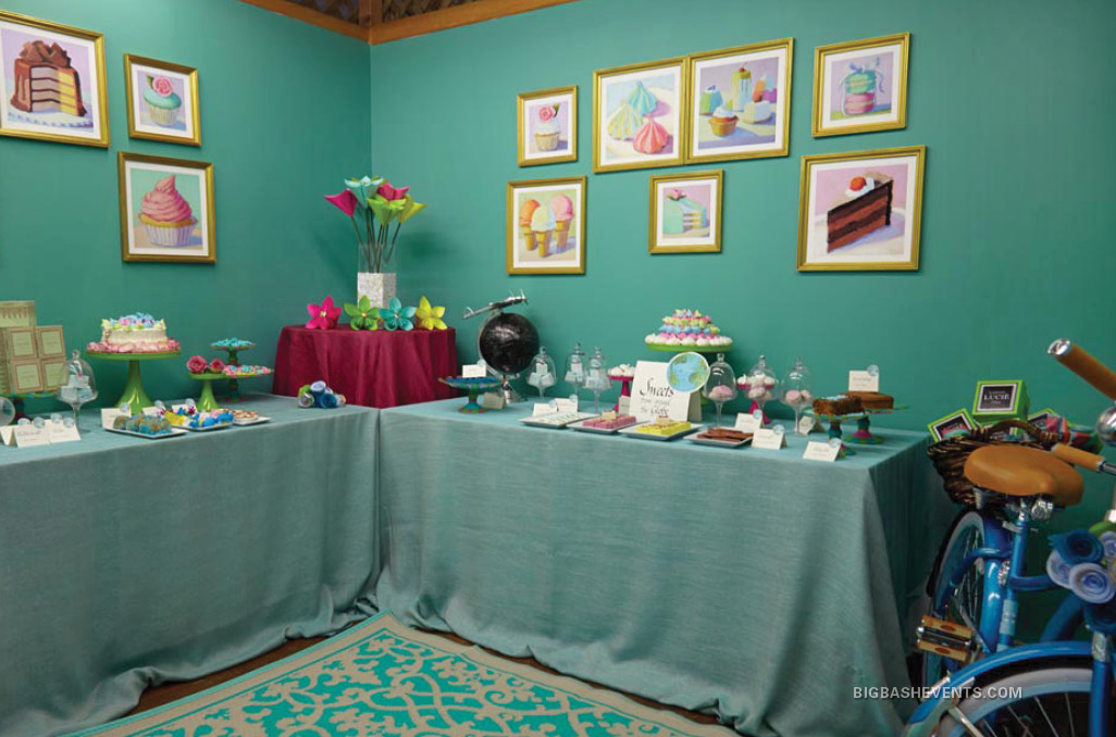 A travel agency celebrated 30 successful years in the business with employees, former employees and friends. The vision was global — airy, whimsical, and relaxing. The dessert room featured yummy treats from around the world!