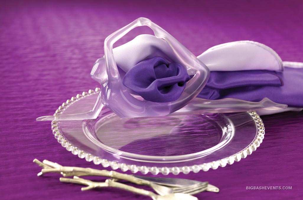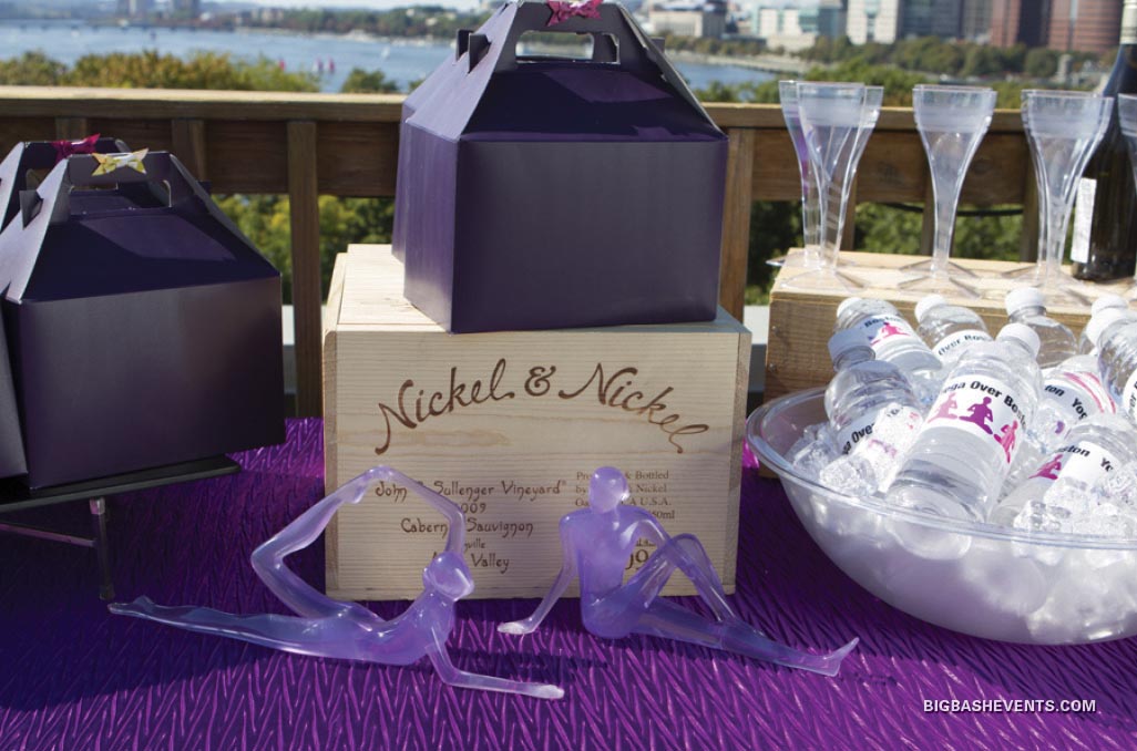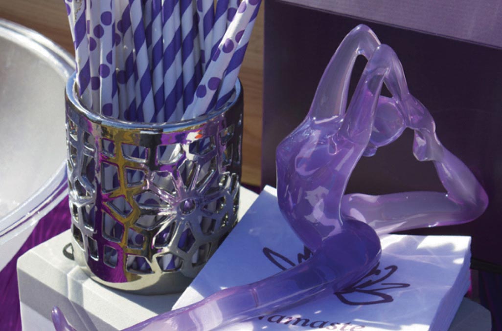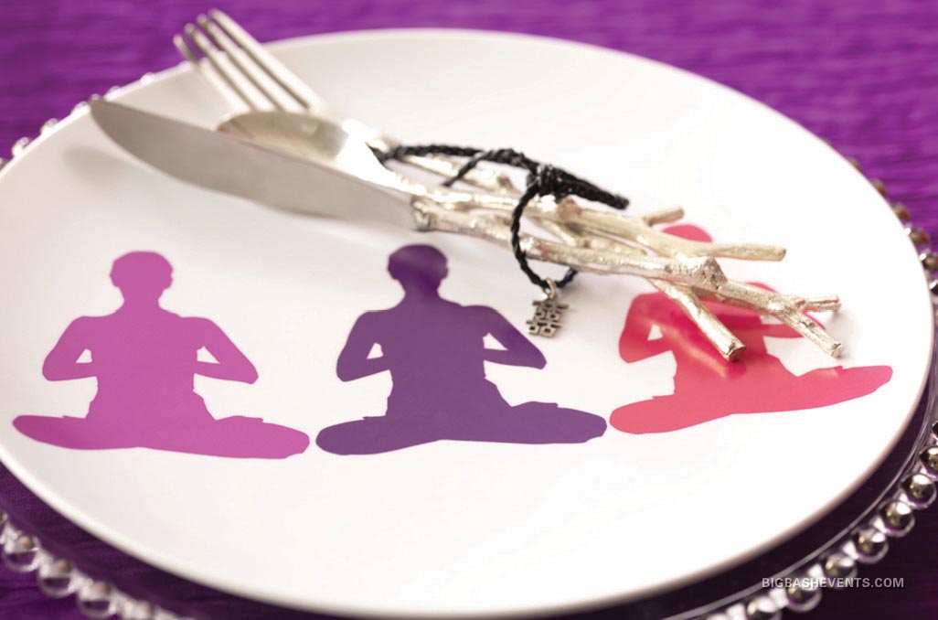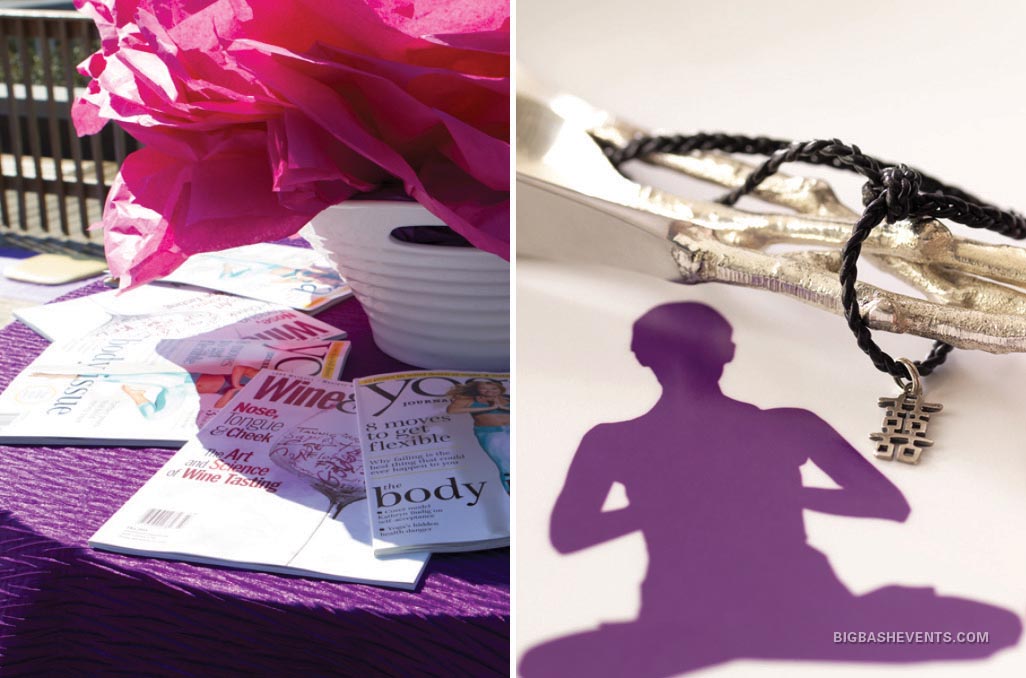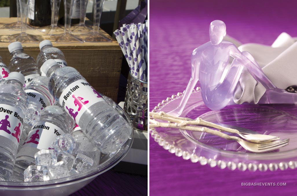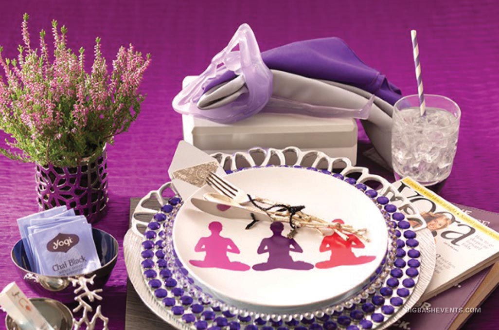 A purple statuette inspired a party: fun & fresh yoga-themed place settings, passionately purple table linens, & purple yoga mats as party gifts.